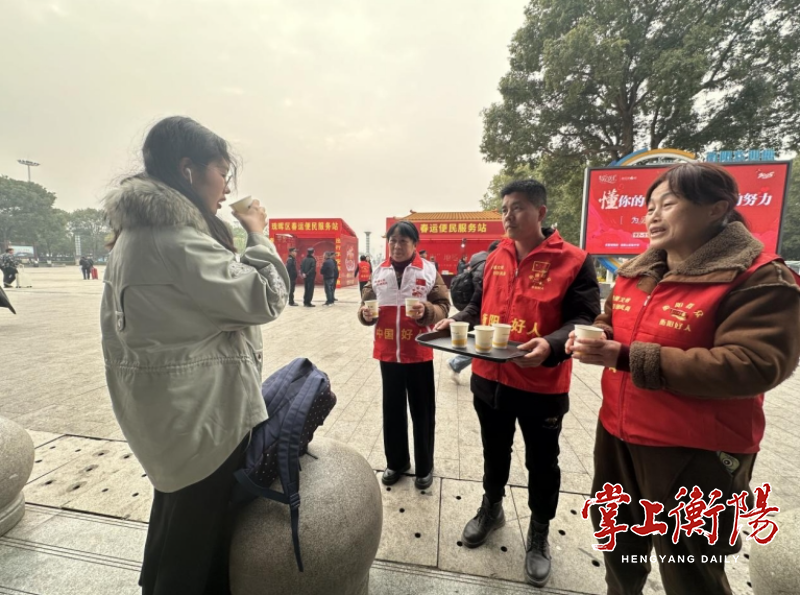 ▲滕志玉、段峥嵘等衡阳模范好人代表为旅客提供免费茶水、引导咨询、行李搬运等贴心服务。